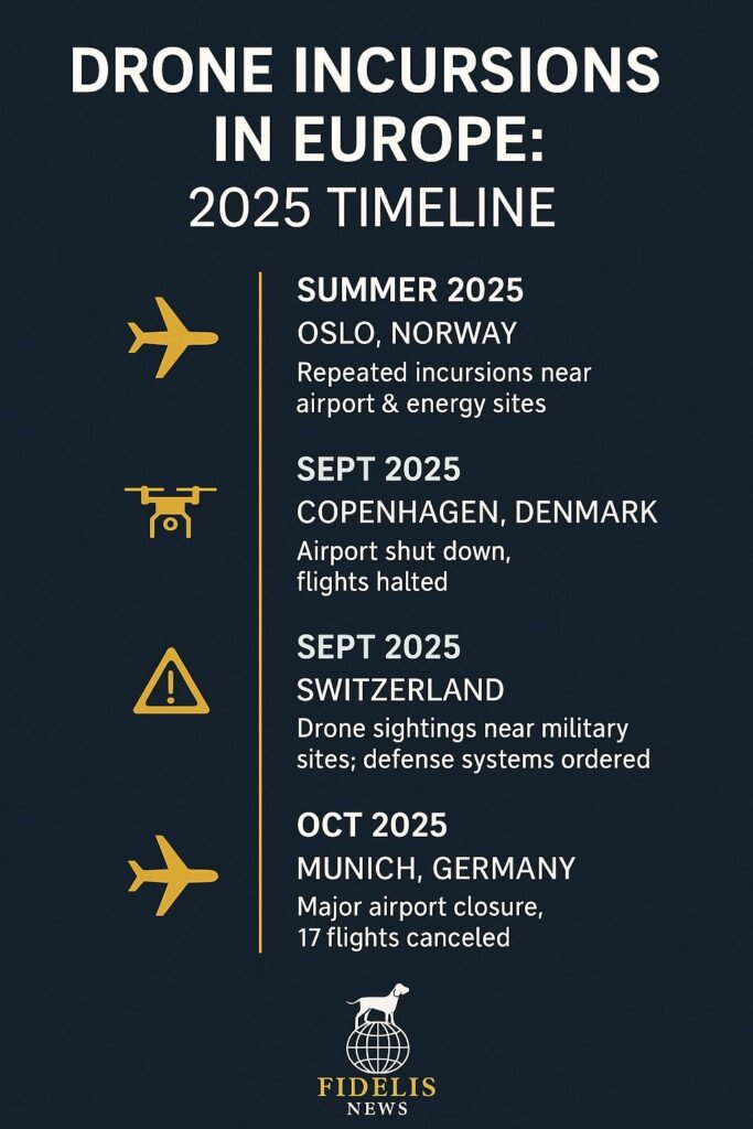 Just weeks earlier, Copenhagen Airport, one of northern Europe’s busiest hubs, halted operations after multiple drones were reported near its airspace. Thousands of travelers were stranded as security forces swept the area and redirected flights.